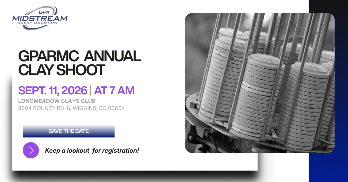 Longmeadow Event Center 8604 Co Rd 6, Wiggins, ColoradoJoin us for the GPARMC Annual Clay Shoot DATE: Friday, September 11, 2026 TIME: 7 a.m. to 5 p.m. LOCATION: Longmeadow Clays Club This is a Members-only Event As a member of the GPA Midstream Rocky Mountain, you will need to log in to your membership account to recess access to registration and to attend […]